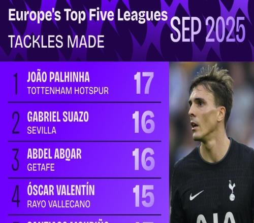 当地时间10月1日,知名数据机构Squawka发布了五大联赛九月份铲球榜,热刺中场帕利尼亚以17次铲球位居榜首。五大联赛九月份铲球榜1、帕利尼亚(热刺):17次2、加布里埃尔-苏亚索(塞维