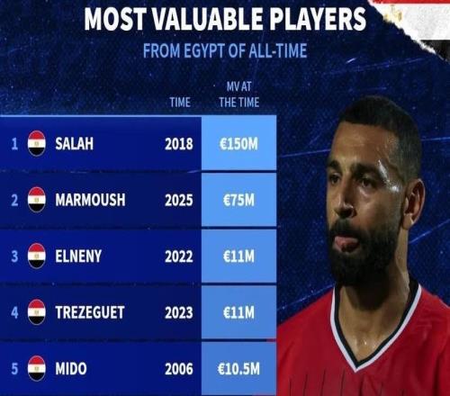 北京时间10月13日,德转统计出了埃及球员历史身价榜,2018年身价曾经达到1.5亿欧元的萨拉赫排名第一,马尔穆什7500万欧元排名第二。德转统计埃及球员历史身价榜:1. 萨拉赫(2018年)